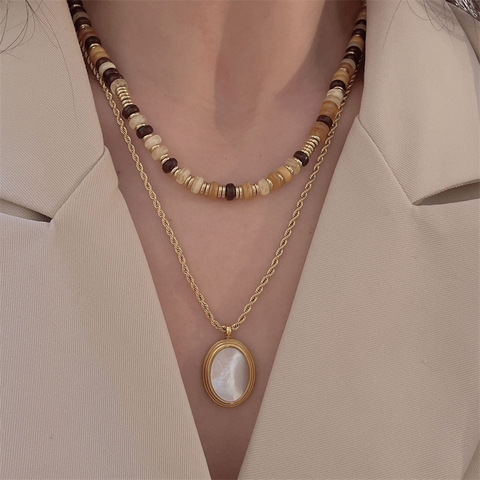 Colar de pingente oval com concha branca, feito à mão, colar banhado a ouro, torção, camada dupla, colar de aço titânio para mulheres