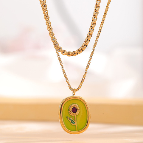 2023 Flor colorida círculo geométrico pingente colar dupla camada titânio aço caixa cadeia 24k ouro girassol colar
